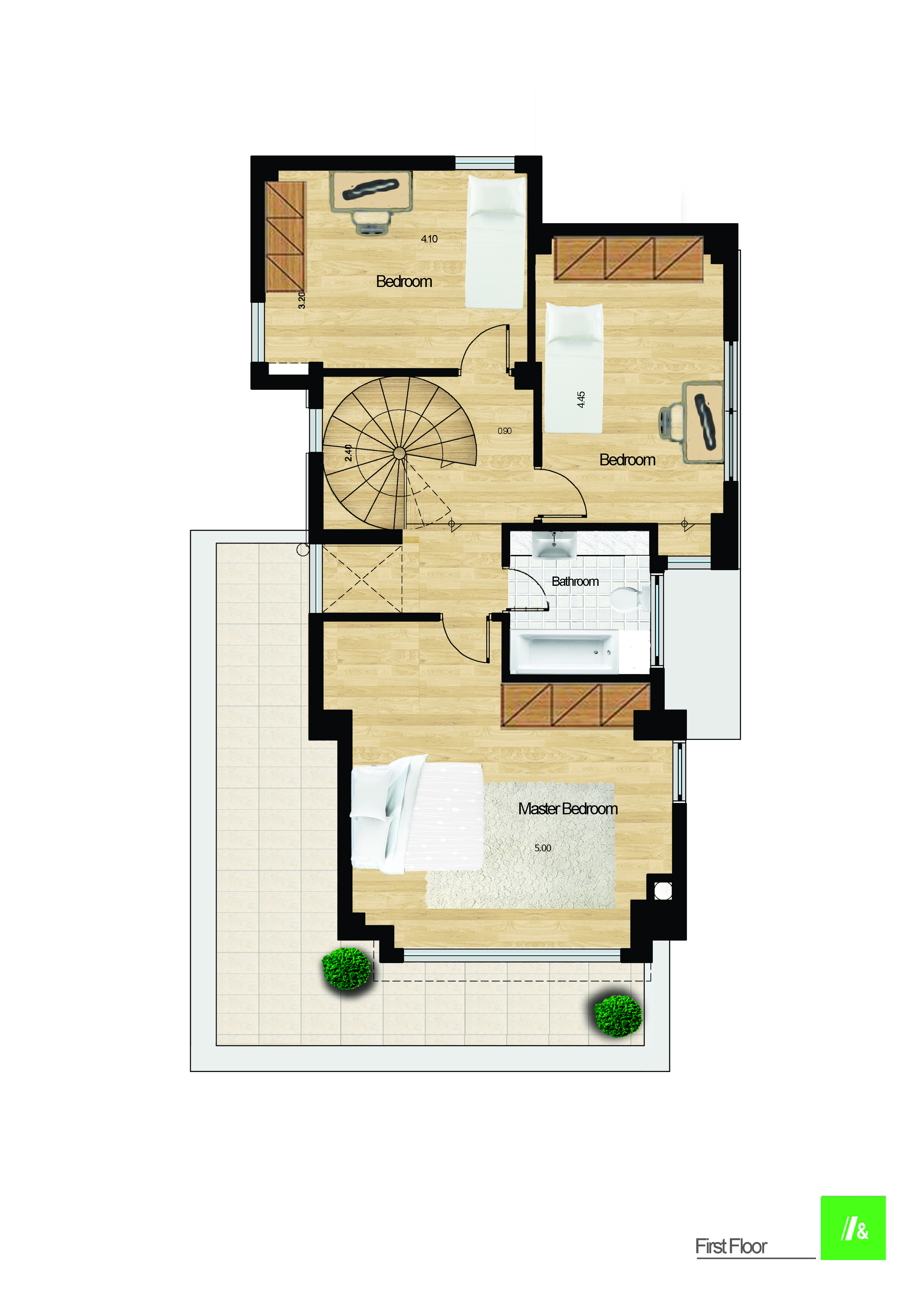 - On the first floor of 75 m² there are two bedrooms, one bathroom and the master bedroom with en-suite bathroom.