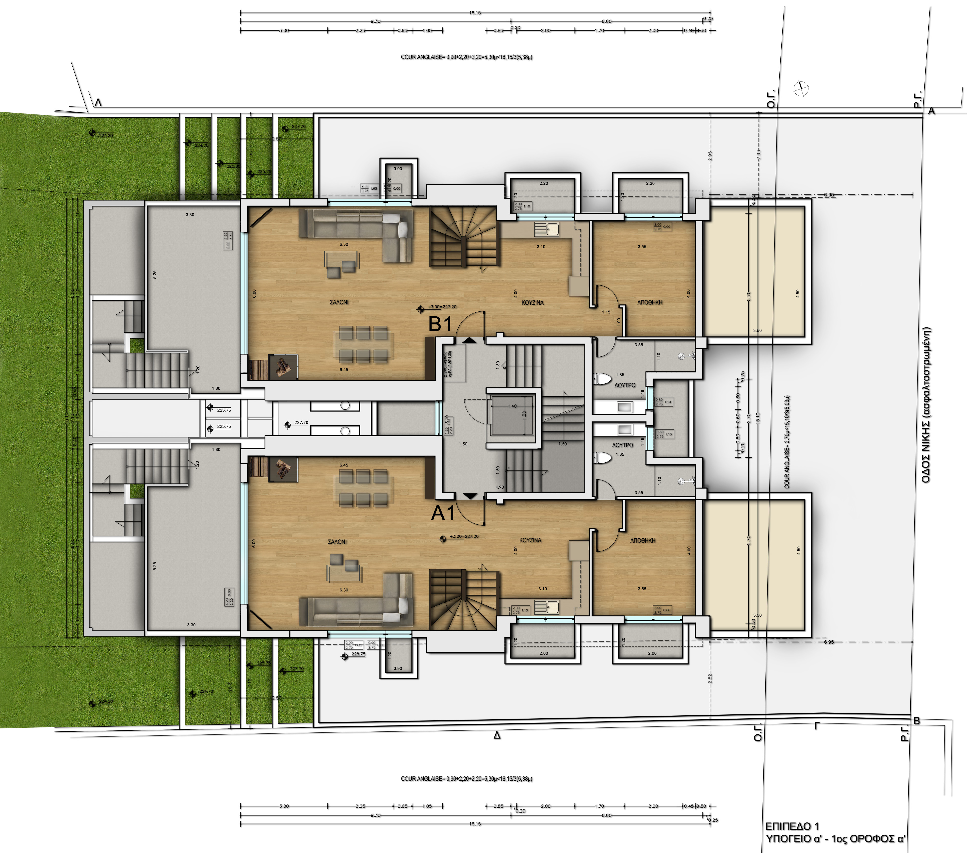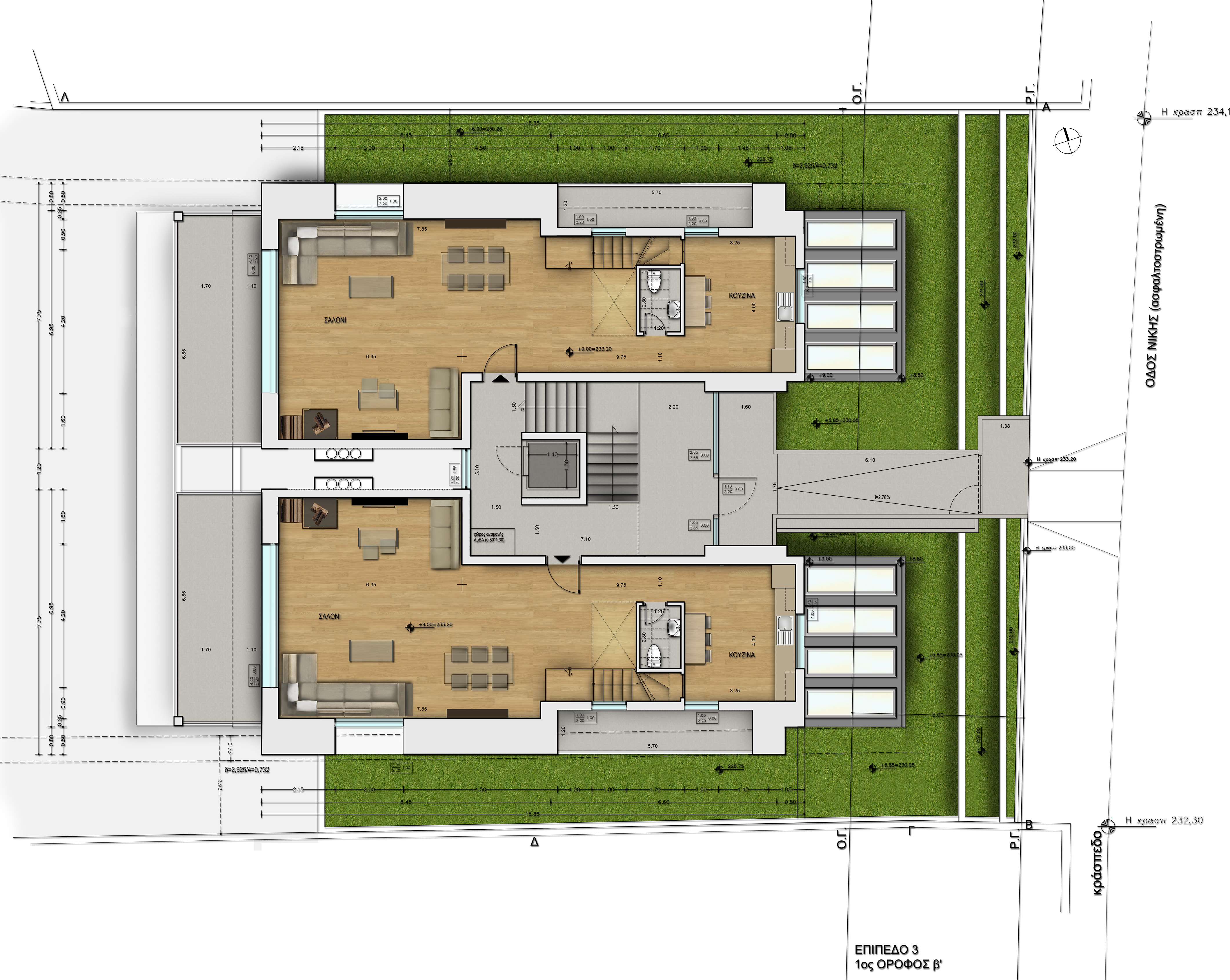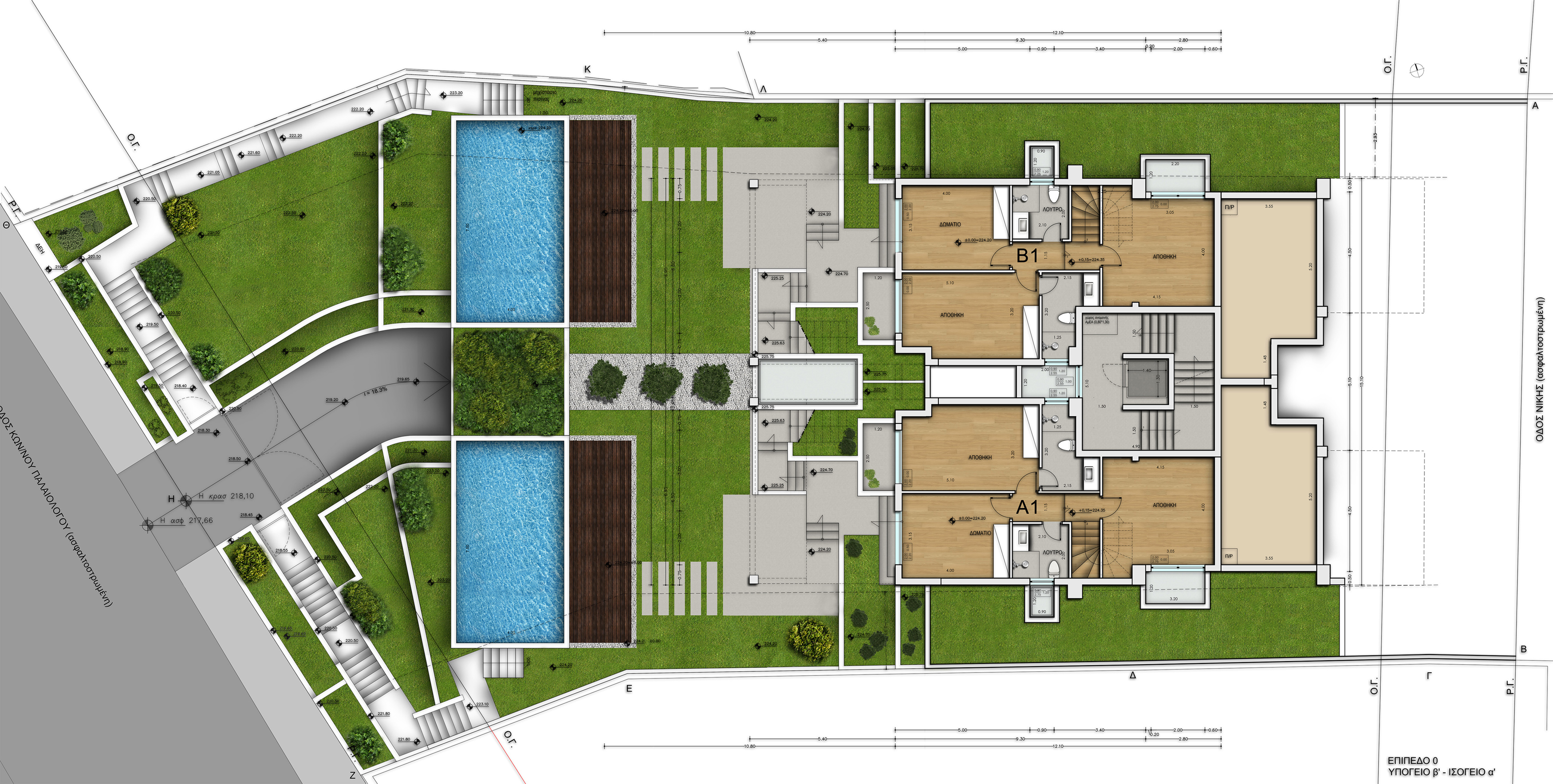The architectural design of the buildings follows the contours of the slope, emphasizing in natural light and functionality. The external surfaces make use of modern materials such as wood, glass and concrete, creating harmony with the surrounding environment. Access to the underground parking is from Konstantinou Palaiologou Str., while in Nikis Str. there is a second entrance leading to a patio with the central staircase and the elevator.