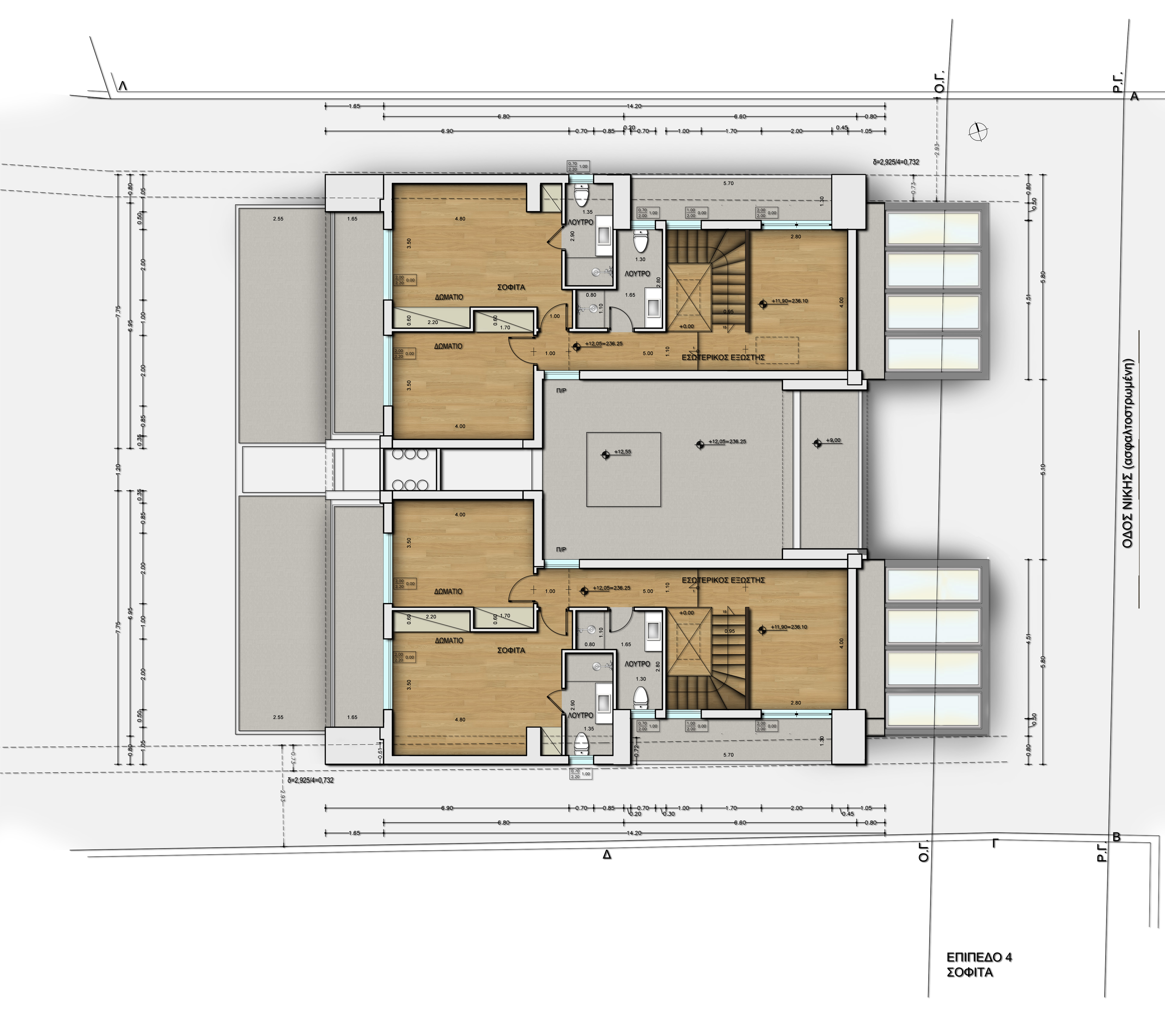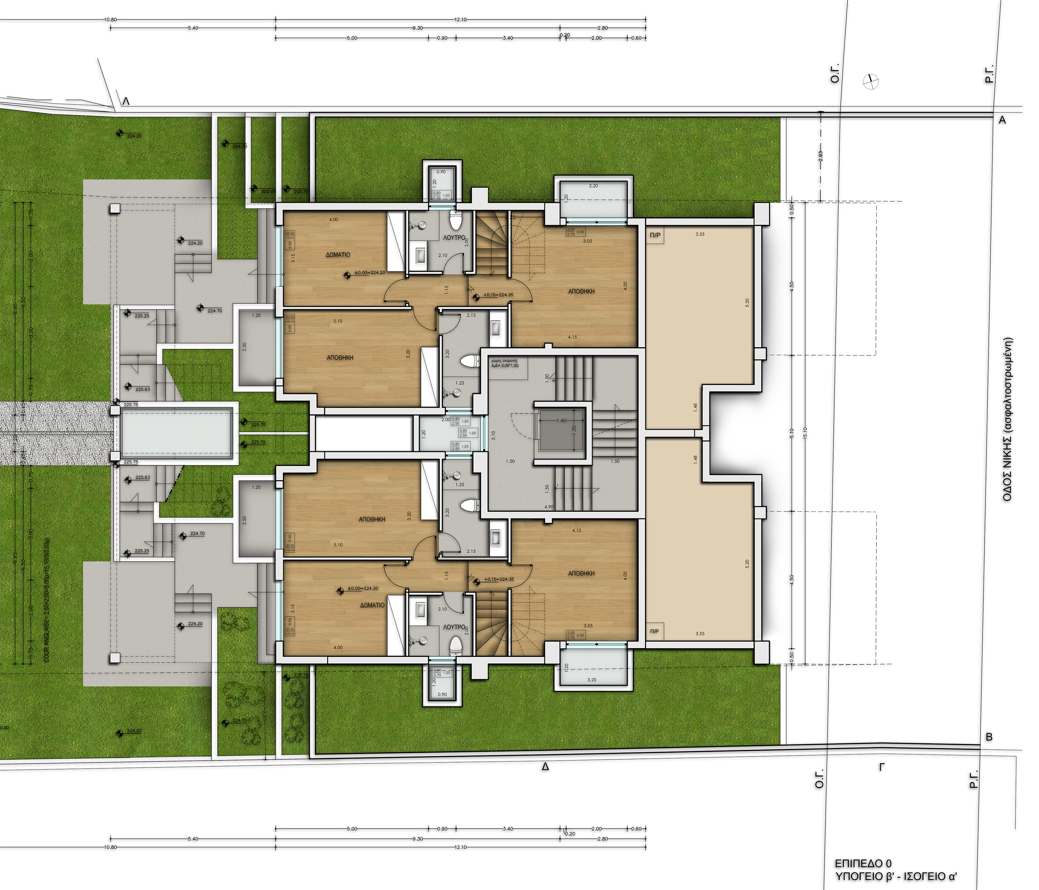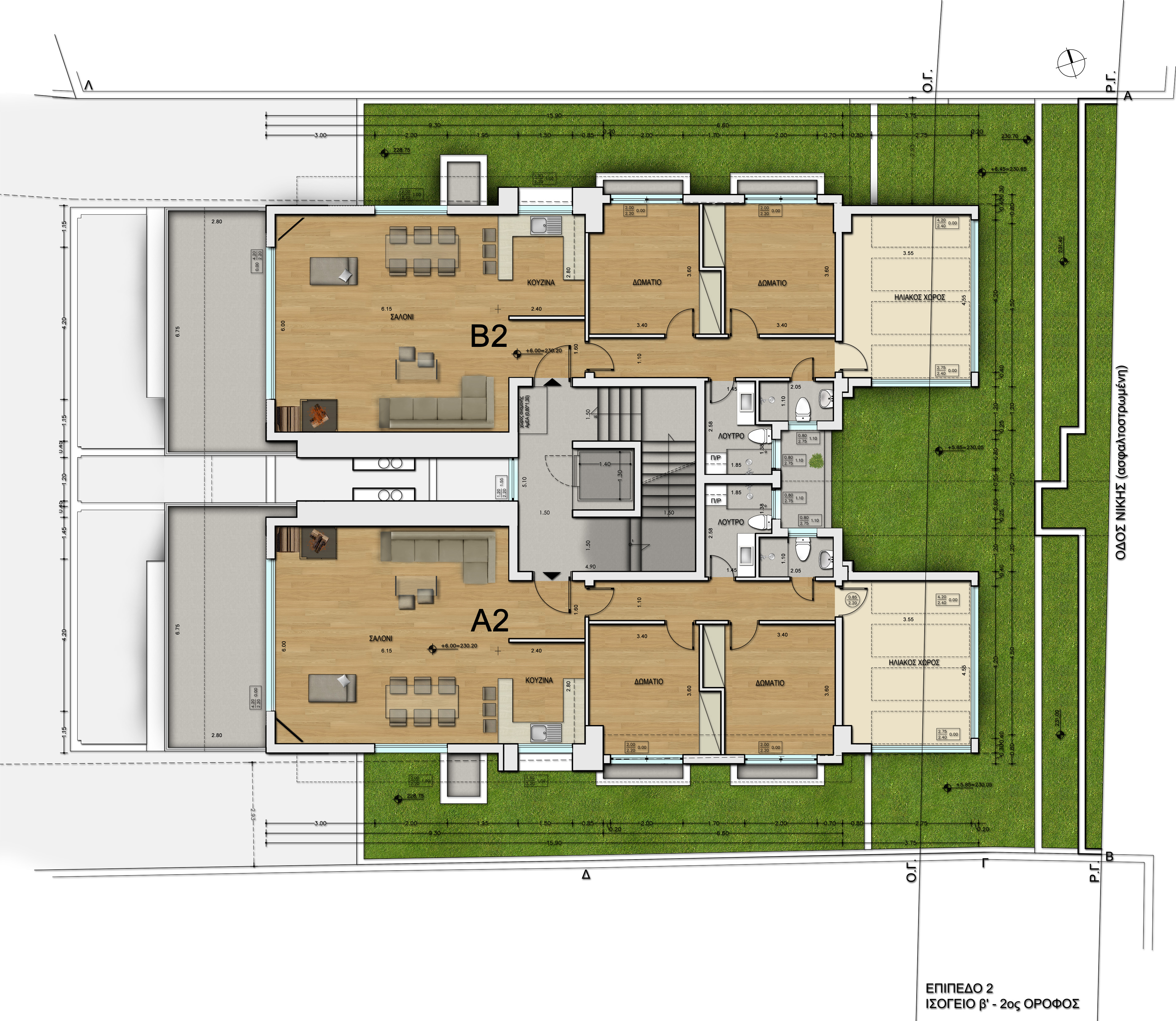 The architectural design of the buildings follows the contours of the slope, emphasizing in natural light and functionality. The external surfaces make use of modern materials such as wood, glass and concrete, creating harmony with the surrounding environment. Access to the underground parking is from Konstantinou Palaiologou Str., while in Nikis Str. there is a second entrance leading to a patio with the central staircase and the elevator.